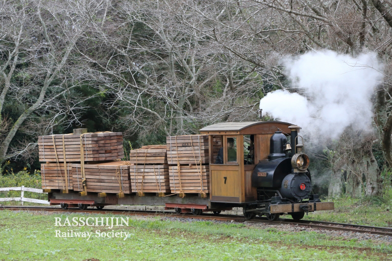 さて今回注目するべきはGINGER。この機関車が動くことは特に珍しいわけでありませんが、今回はプチイベントとして普段は側線の隅に置かれている枕木運材台車を牽引、本線を2周しました。枕木満載の貨車を蒸気機関車で引いたのは今回が初めてで、荷崩れないよう安全確保のもと行われました。